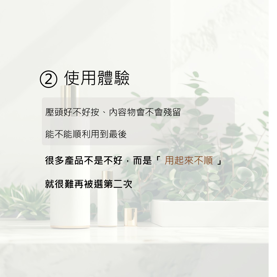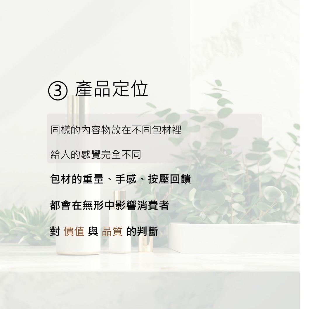產品定位:同樣的內容物放在不同包材裡,給人的感覺完全不同,包材的重量、手感、按壓回饋,都會在無形中影響消費者,對價值與品質 的判斷。